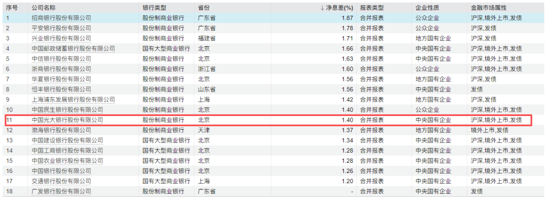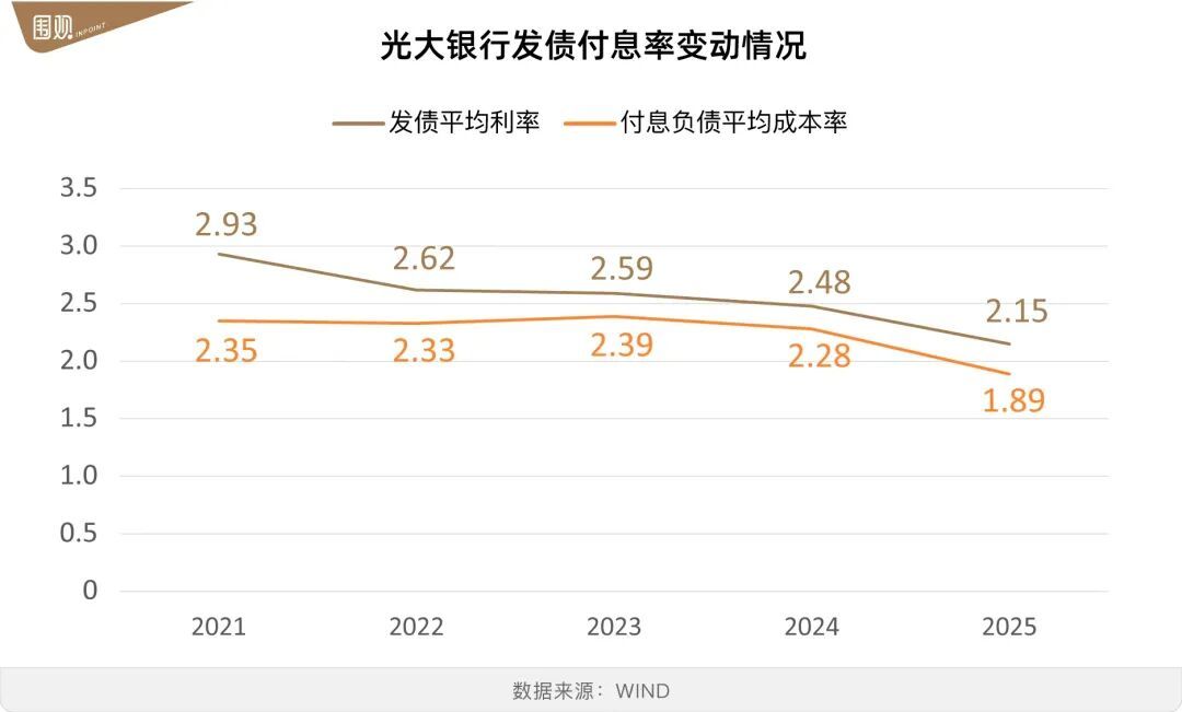 2025年,光大银行净息差为1.40%,在18家A股上市银行中位居中卑鄙。净息差年度降幅收窄,但下行压力犹存。