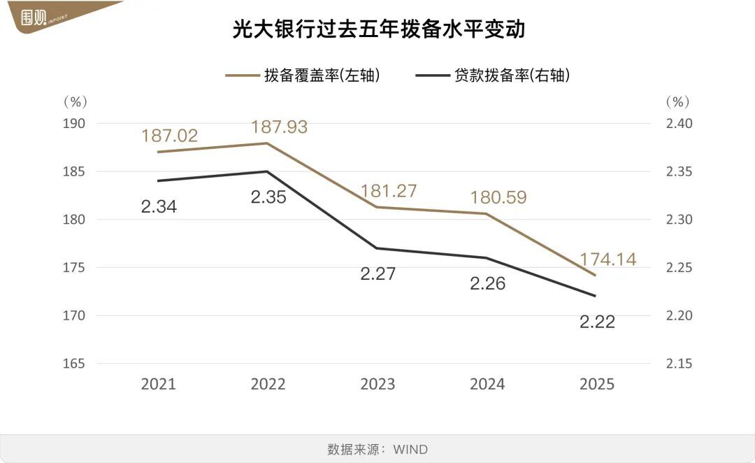 2025年,光大银行贷款拨备率缩小至2.22%,同比缩小0.04个百分点。