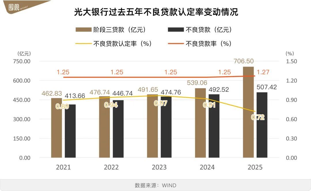 2025年末,光大银行阶段三贷款总数为706.5亿元,同比激增30%以上。