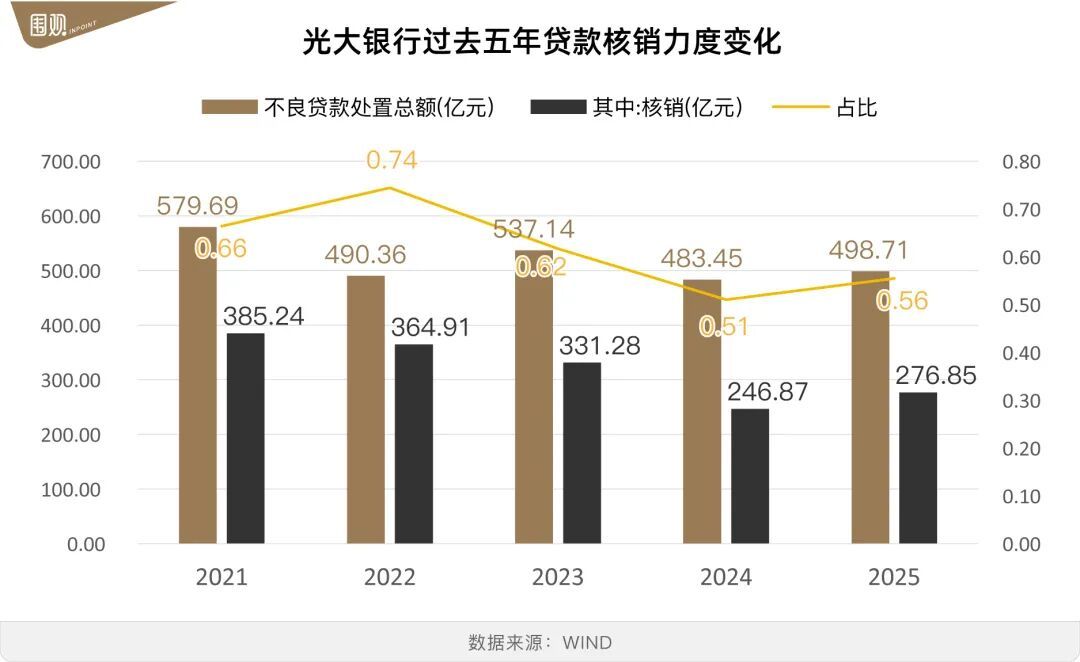 另一方面来自核销端的减少。2025年,光大银行共处理不良贷款498.71亿元,其中核销不良贷款276.85亿元,占比55.51%,同比增长超4个百分点,但纵向对比仍处于相对低位。