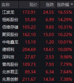 早盘,存储芯片板块阐扬活跃,公法发稿,江波龙涨超16%,恒烁股份涨超14%,佰维存储、聚辰股份涨超10%,中电鑫龙、德明利、深科技涨停。