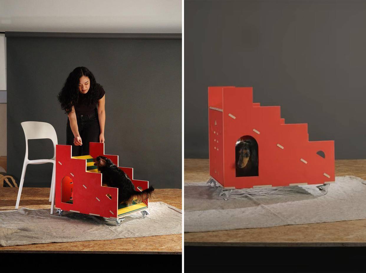 一样地,西班牙联想师Mariana de Delás的这件作品是为了她的迷你香肠犬Pepas联想的,接收了一个小陡坡方法,底板四角加装了带固定功能的滚轮,两侧接收启齿联想,可供宠物入内进行休憩。