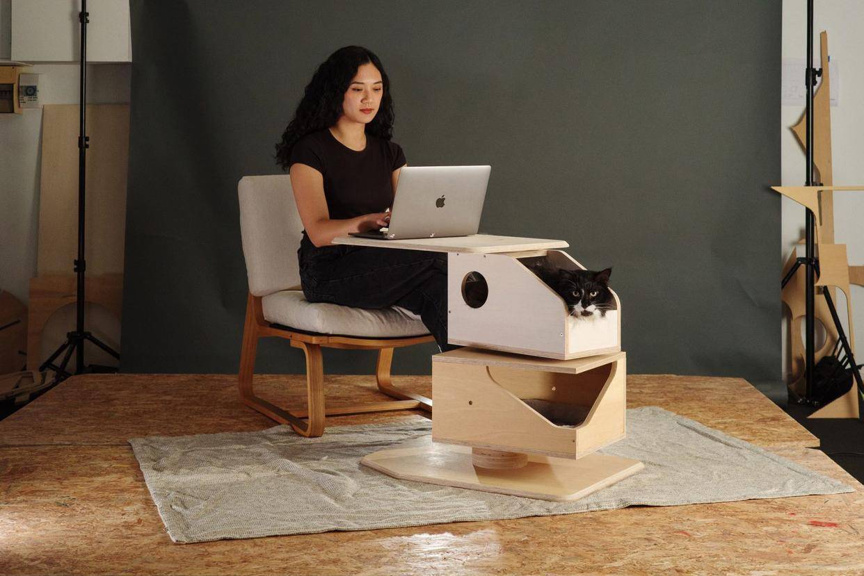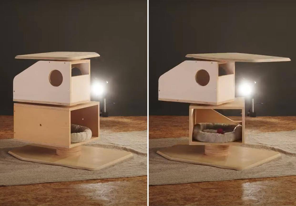 澳大利亚联想师Matt Reynolds联想的是一座旋转结构的“猫塔”(cat tower),其部分联想灵感来自起重机。该联想包括一个平板面,宠物主东说念主可用作电脑桌面或简餐桌,平板下设有两个供猫咪走避、休憩的盒子状隔间。可旋转结构也让这件宠物居品更具可不雅赏性,也不会过度占用空间。
